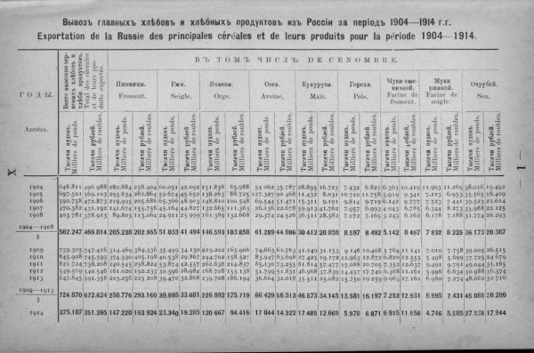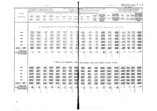 По данным центрального статистического комитета в 1912 г. в 50 губерниях Европейской России под посевами находилось всего 76,2 милл. дес., считая здесь все зерновые хлеба, бобовые растения, картофель, лен и коноплю; в остальных же частях империи посевная площадь в том же году равнялась: в Привислинских губерниях — 5,2 мил. дес., в Предкавказье 6,4 мил. дес., в Закавказье 1,9 милл. дес., в Сибири — 6,0 мил. дес., в Степном крае 2,2 мил. дес. и, наконец, в Туркестане 1,7 милл. дес. Всего же по империи — 100,1 миллионов десятин. Таким образом на долю всех частей Европейской России приходится 9/10 всей посевной площади."