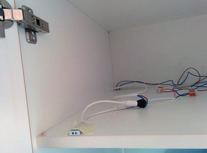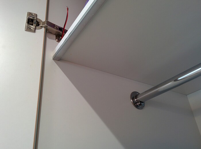 На самой верхней полке поставил датчик, но пока что оставил тестовый вариант: не убирая провода и не крепя намертво, потому что ещё не решил: поставить датчик на левую дверку или на правую. Хотя можно на обе створки по датчику поставить, но пока тоже не уверен, нужно ли. От датчика провод уходит дальше к блоку питания.