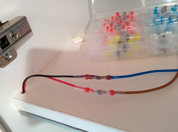 Кабель оказался толстоват для маленького кабель-канала, так что снял внешнюю изоляцию, оставив два отдельных провода и приделал их к коннектору с помощью соединительных термоусаживаемых гильз. Удобная штука, если есть строительный фен: в такой гильзе посередине припой с низкой температурой плавления. Скрутил два провода, надвинул гильзу, нагрел, припой растёкся, а термоусадка обжала итог. Видел видео, где такие гильзы даже обычными зажигалками нагревают. Может, и не так надёжно, так полноценная пайка, но для не сильно нагруженной линии должно хватить.