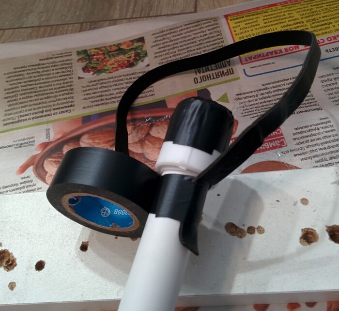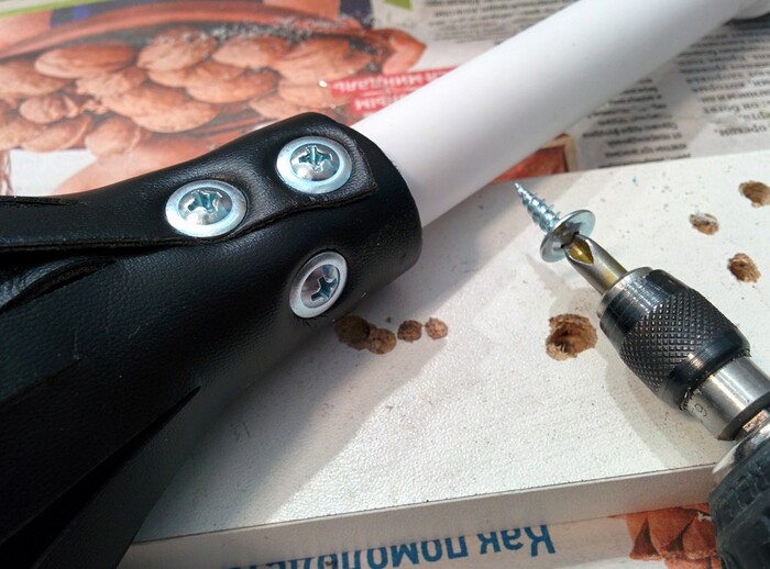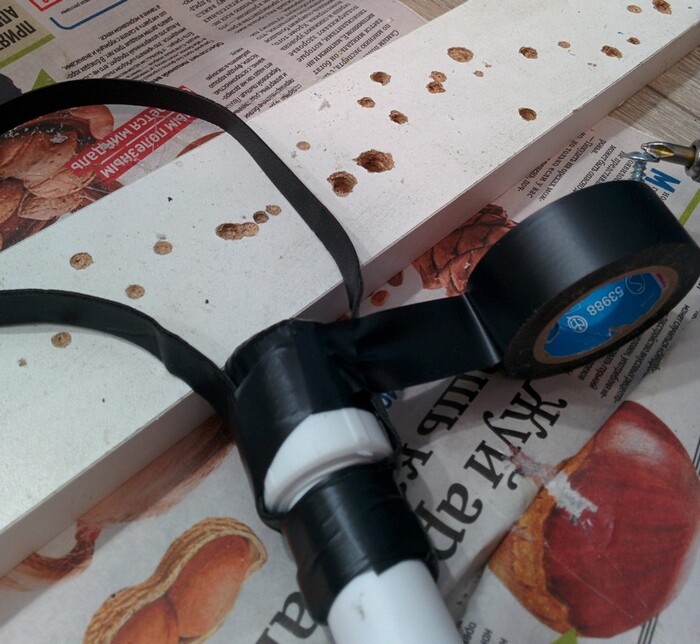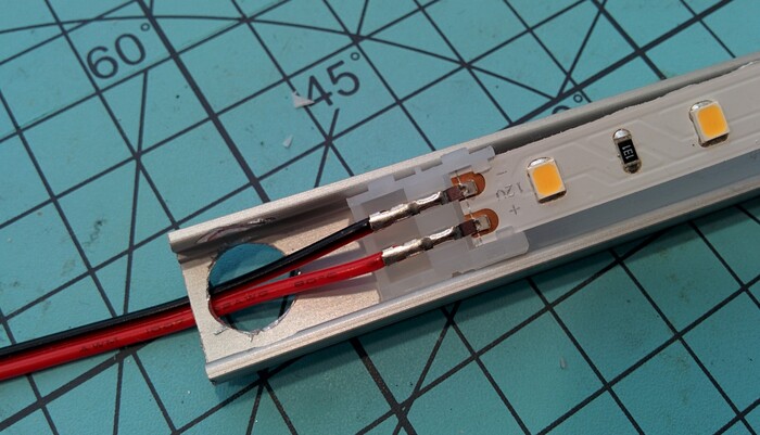 Отметил на полке место дырки в профиле и просверлил полку насквозь, чтобы просунуть провод. Хватило сверла на 4мм.