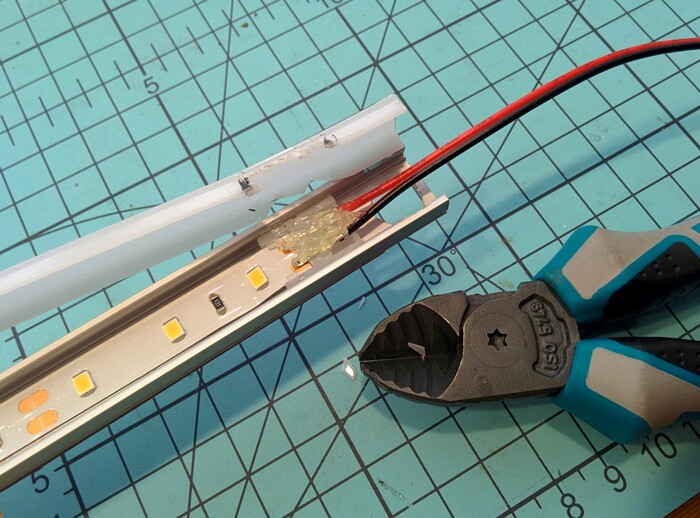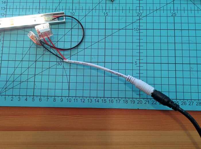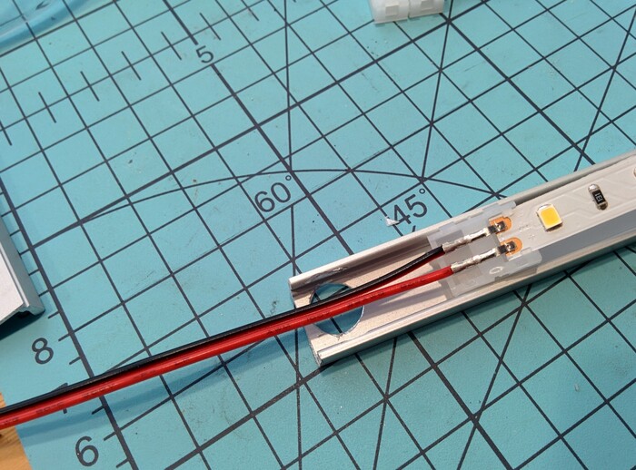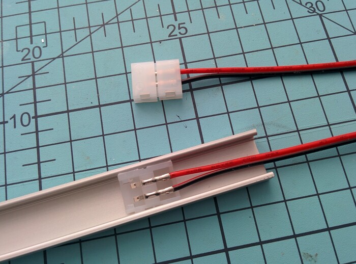 Перед приклеиванием профиля проверил, что всё работает, потому что потом исправлять будет сложнее. Как уже говорил, уважаю рычажные клеммы и стандартные разъёмы за простоту подключения.
