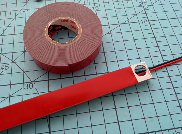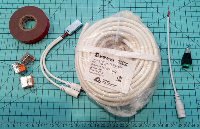 Так что купил готовый вход для штекера 5.5х2.1 (из которого уже два провода торчат), сам штекер взял с клеммами. На сайте магазина был вариант штекера с таким же выводом двух проводов, но в отзывах писали, что производитель сэкономил и контакт сильно греется, решил не рисковать. Ток на одну секцию шкафа будет всего около 0.5 Ампера, но я люблю надёжность. Также провод ПВС 2х0.75 и двусторонний скотч. Возможно, сечение 0.75 в моём случае избыточно, коннекторы вообще подключены проводом 22AWG (сечение 0.3), но разница в цене нескольких метров не настолько критична.