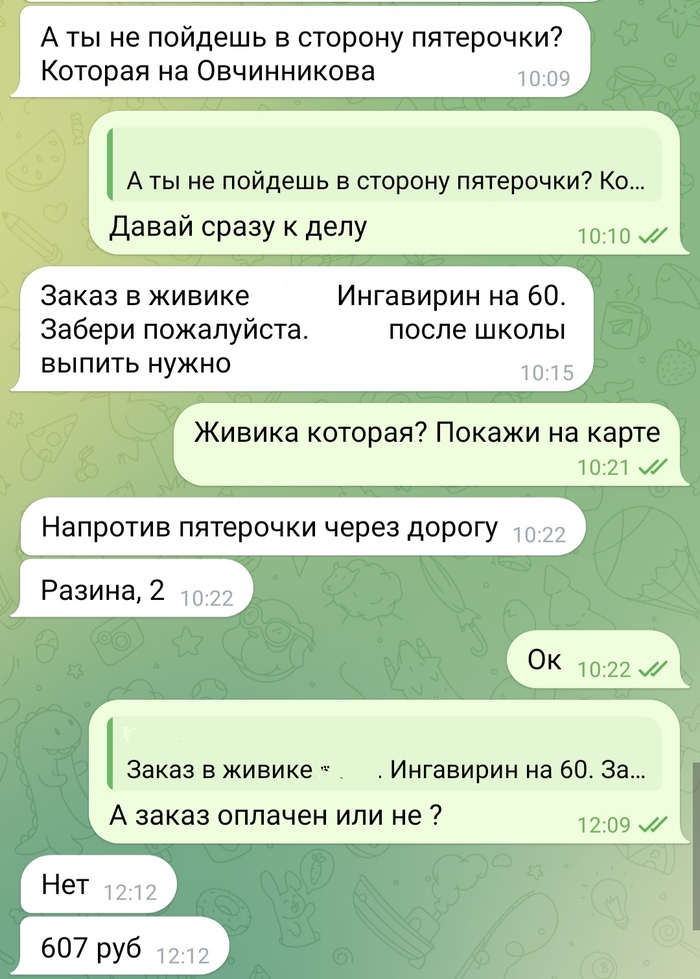 Отстояв очередь, мы подошли к окошку, заказали у тётеньки-аптекаря что-то и она ушла искать. В это время к окошку подбегает крайне неприятного вида женщина и отпихивая нас от окошка схватила сумку, которую она оставила на полочке под тем окном. Брезгливо посмотрела на нас и ушла к выходу. Мы с братом в шоке. Во-первых мы не так часто выезжали в центр без взрослых, во-вторых что бывают такие мерзкие люди.