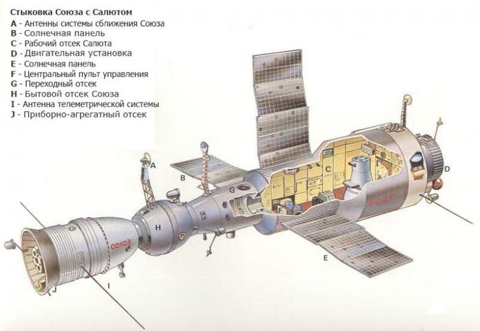 Схема показывает стыковку «Союза» (слева) с «Салютом-4». Корабль соединен с переходным отсеком (G), люки которого ведут в секцию H на «Союзе» и секцию C на станции. Начиная с 6 поколения «Салютов», секция D была модернизирована: в ней находилось не только механическое отделение, но и стыковочный узел. Корабли «Союз» способны стыковаться с обоими узлами, тогда как корабли «Прогресс» могут стыковаться только с задним.