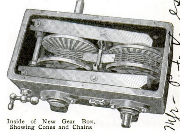Новый тип коробки передач, разработанной в Англии, обеспечивает непрерывный диапазон изменения скорости без ступеней, характерных для коробок передач обычного типа. Как ведущий, так и ведомый вал имеют по два конуса с ребрами на внутренней стороне, которые входят в зацепление с боковыми пластинами приводной цепи. Расстояние между конусами на каждом валу может меняться, поэтому, если их держать вплотную друг к другу, цепь подтягивается к краю конусов, в то время как если их раздвинуть, цепь соскальзывает вниз к центру. Винтовое устройство с двумя рычагами, работающее по тому же принципу, что и столярный зажим, отвечает за перемещение конусов (сводит и разводит). Диапазон скоростей, от понижающей до повышающей, ограничен только размером конусов. При желании может быть предусмотрена передача заднего хода.