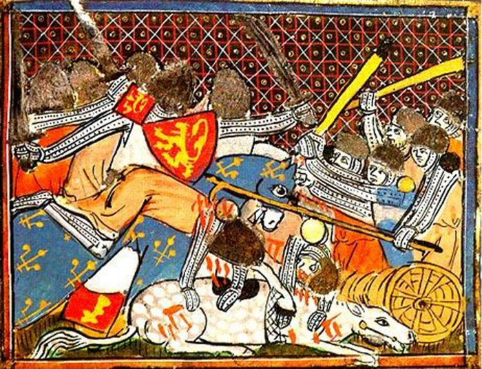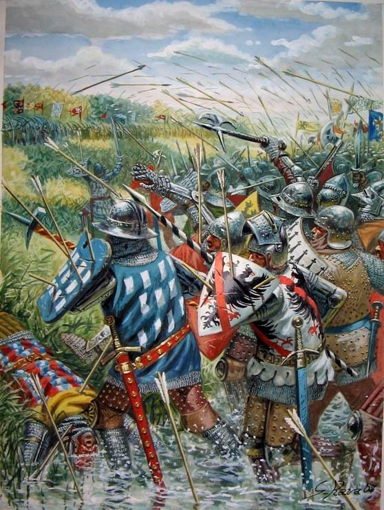 Есть еще «Фландрские хроники», рассказывающие о крупном многоактовом сражении 3 тыс. лягушатников против 16 тыс. англо-фламандцев. С лучниками, волчьими ямами, атаками французских рыцарей, мастерски истребляющих пехоту, перечнем командующих силами и прочими прелестями. В результате сражения войска Робера Артуа были разбиты и отступили.