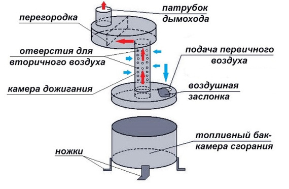 Газы и вода (в виде водяного пара) - уходят в дымоход, шлаки выпадают в виде твёрдых соединений, а вот тепловая энергия - утилизируется тепловым оборудованием для дальнейшего использования, причём часть этой тепловой энергии - необходимо потратить на поддержание температуры для процесса кипения и испарения масла, чтобы процесс горения был непрерывным.