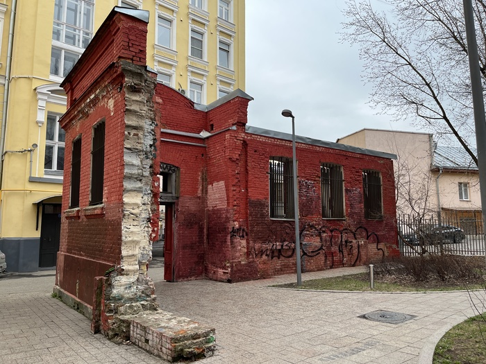 Если между домами 11 и 15 по Маросейке вы свернёте во двор, то наткнётесь на руины старого московского дома, выкрашенные в красный цвет. Что это такое?