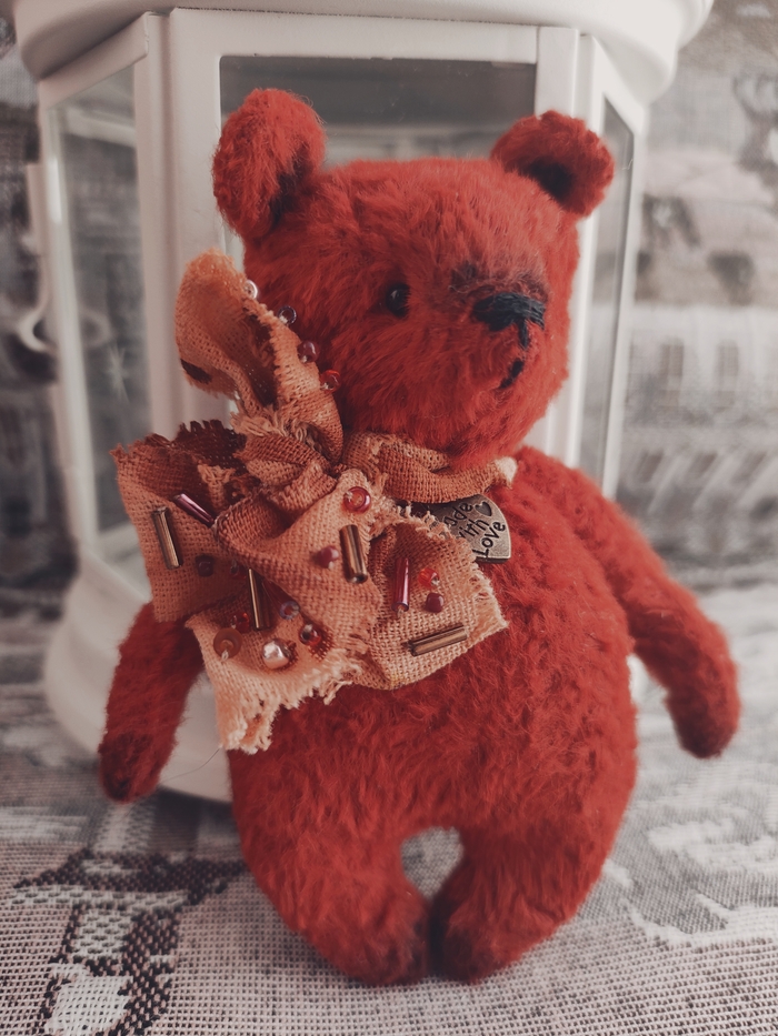 Почему осень – это про серость и сырость? Нет, осень одевает деревья в багрянец, охру и золото, развешивает на ветках чистый хрусталь. По утрам иней уже касается нежных хризантем, но они продолжают цвести. Сердцевинка у них тёплая. Такое же тепло – яркий осенний лучик – хранит в себе крохотный Мини-Винни. Малыш 11 см, три шплинта. Бант расшит японским бисером, не снимается. Красная немецкая вискоза, глазки - стекло, внутри сосновые опилки