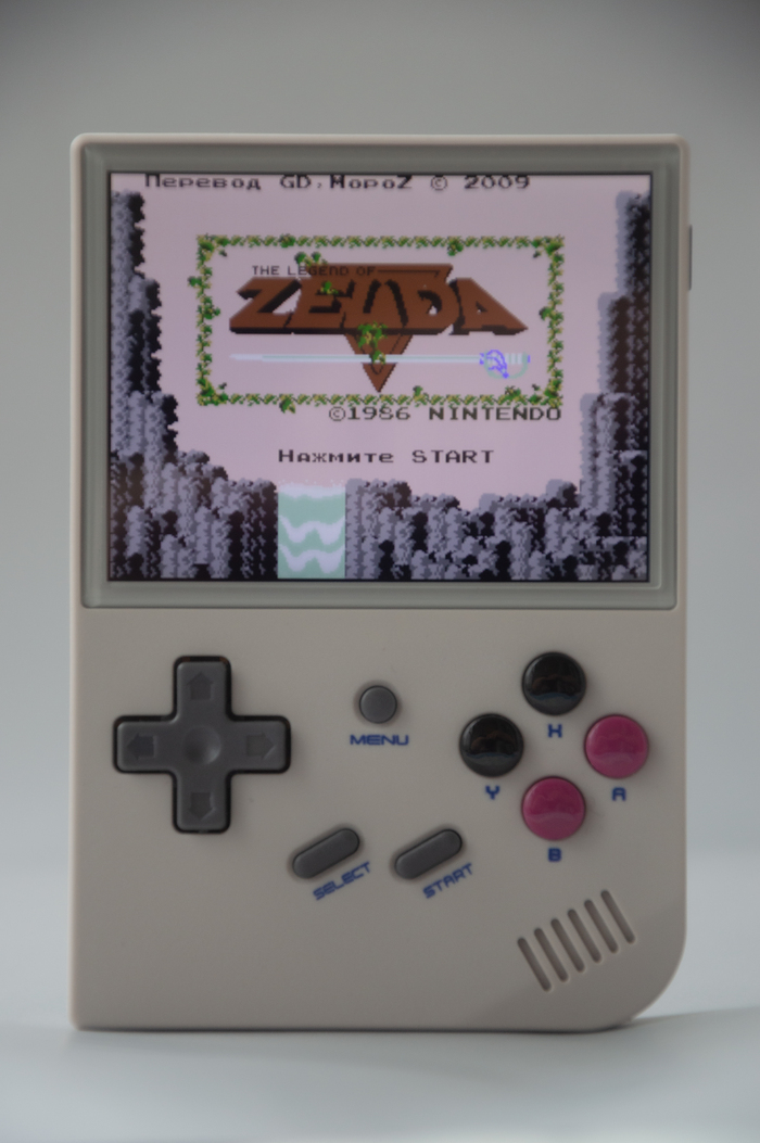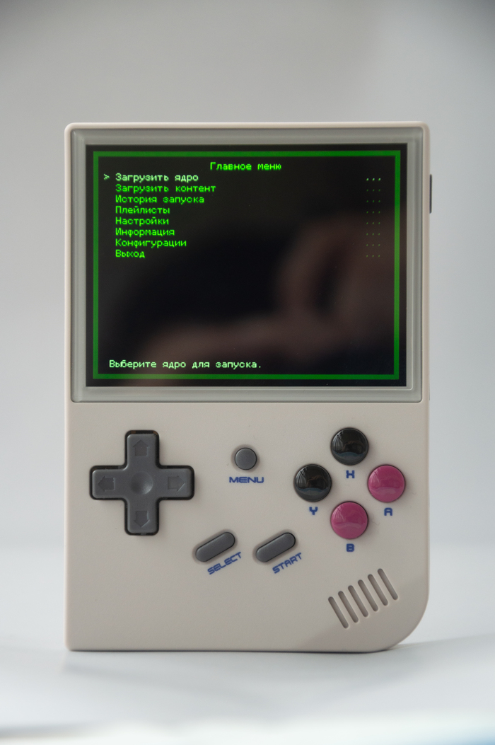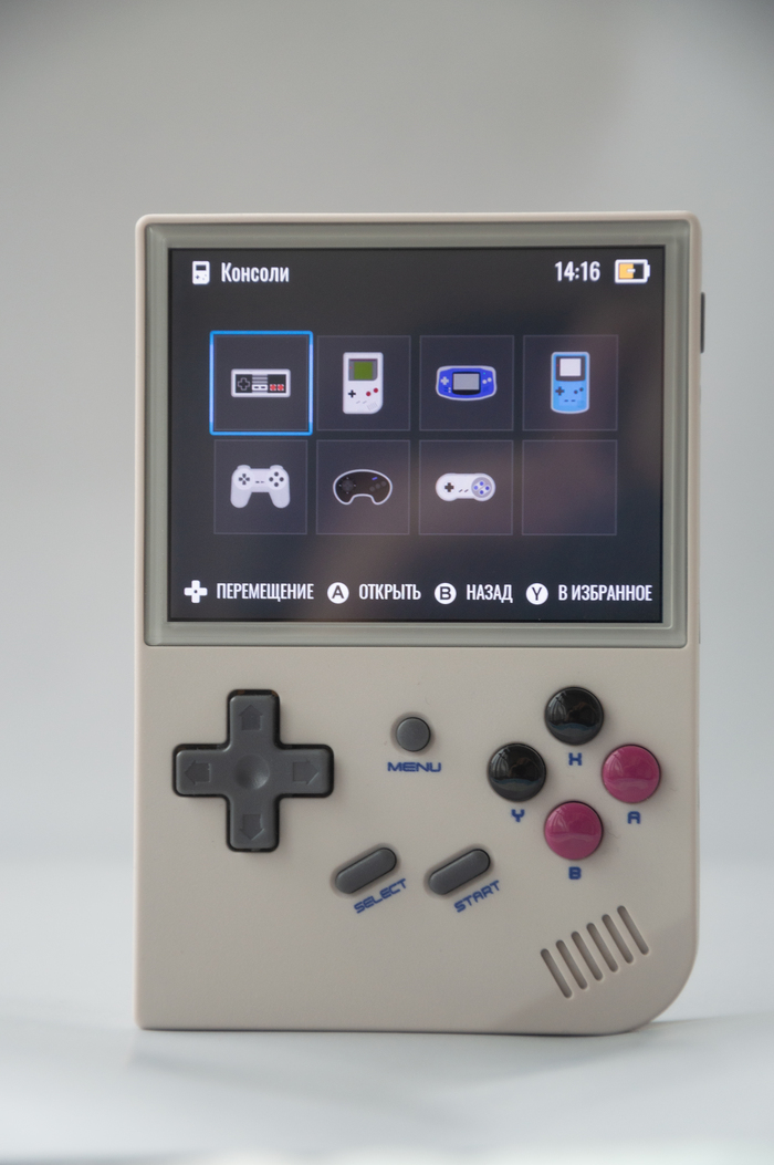 Лицевая панель устройства. Помимо обычных навигационных клавиш, ещё присутствует стик, что очень удобно. Классические кнопки XYBA и как по мне очень удобная крестовина. Так же клавиши start и select позволяют выходить из эмулятор и использовать сохранения.
