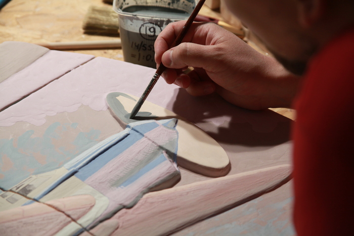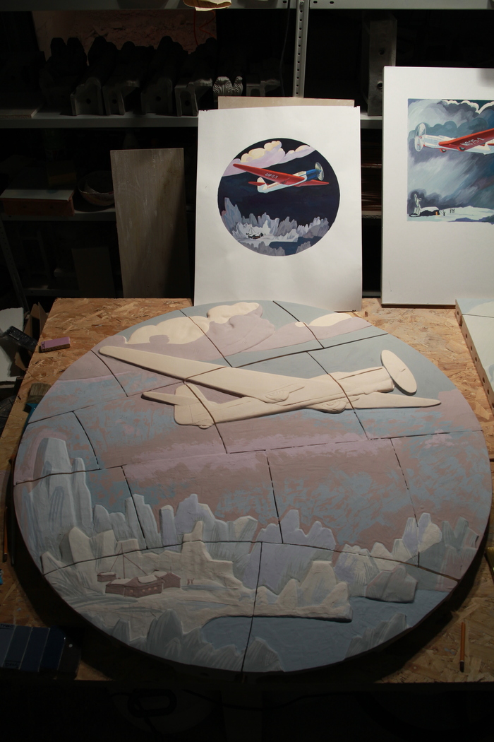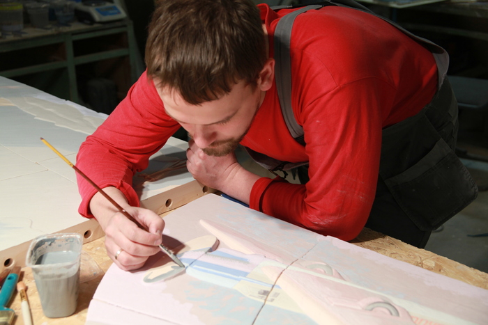 Разделив изображение на 84 элемента, мы стремительно вылепили рельеф. Лепили не просто на стене, а сразу на моделях изразцов, чтобы упростить себе процесс изготовления рабочих форм для литья с этих моделей. Как видите, швы сразу заложили в рельеф: