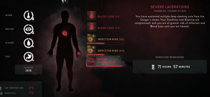 Если очень кратко, у нас зима, поэтому, кроме пропитания, необходимо еще следить и за температурой. Для этого по миру раскидано много одежды, за состоянием которой тоже важно следить или создать свою, по типу кроличьей шапки или штанов из оленя.