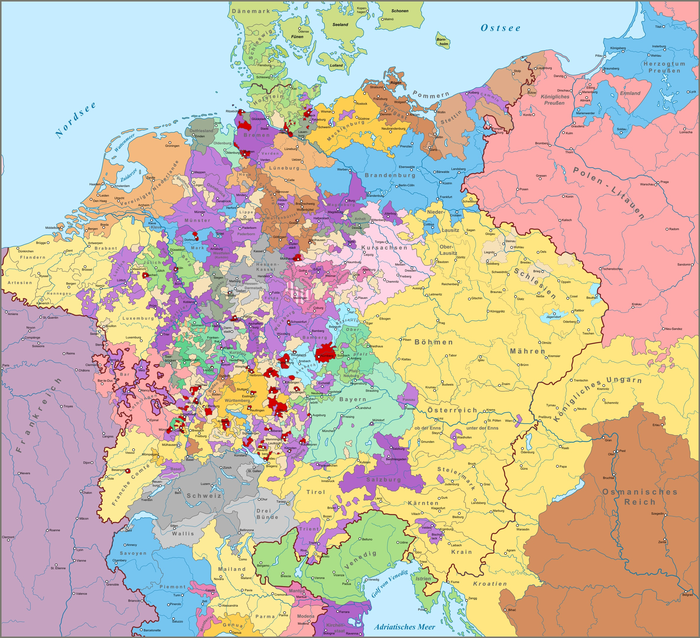 Отдельно долго и сложно утрясали повестку дня. 25+ лет уже прошло, а в Священной Римской империи, напомню, за тысячу разных правителей было, и из них сотни, наверное, три было тех, кто реально чем-то правили. Не говоря о внешних державах. Все считали, что другие их хотят кинуть (и были правы). Все хотели компенсаций землей и деньгами. Как тараканы из всех щелей повылезали даже те, кто имел какие-то довоенные претензии – ну, кто дожил. К тому же, за десятилетия войны накопилось множество фактических переделов земли, много какие титулы и владения уже успели унаследовать, в общем, черт бы ногу сломал. Переговорный процесс выглядел примерно так.