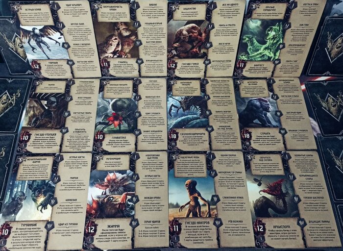 Во вторую фазу ведьмаки могут помедитировать или вступить в бой с монстром. Если что, гончая не считается монстром. И дерутся с ней в первую фазу, а не во вторую. Монстра, как и гончую, можно бить скопом. Например, если три ведьмака пришли бить монстра, то определите, кто будет главным нападающим, так как остальные будут только помощниками. Помогающие ведьмаки могут скинуть любое количество карт из руки. За каждую скинутую карту монстр теряет хп, а нападающий ведьмак наоборот - набирает себе в руку. После битвы нападающий ведьмак раздаёт всем помогающим ведьмакам по одному своему трофею ведьмачьей школы.