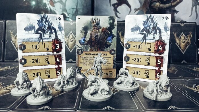 Например, перед нами гончая третьего уровня, у неё 6 хп. Считаем, сколько урона нанесли все ведьмаки. Если меньше 6-ти, то все, кто участвовал в битве, скидывают всю руку. Если ровно, то вы просто победили гончую и получили за её победу один из 6-ти бонусов: карты, следы, навыки. А если больше 6-ти, то помимо плюшек за победу, мы сносим щиты Дикой охоты. Если ведьмаки нанесли 9 урона, то 6 ушло в собаку, а три в щиты. И таким образом в финальном раунде придётся пробивать уже не 120 щитов, а меньше.