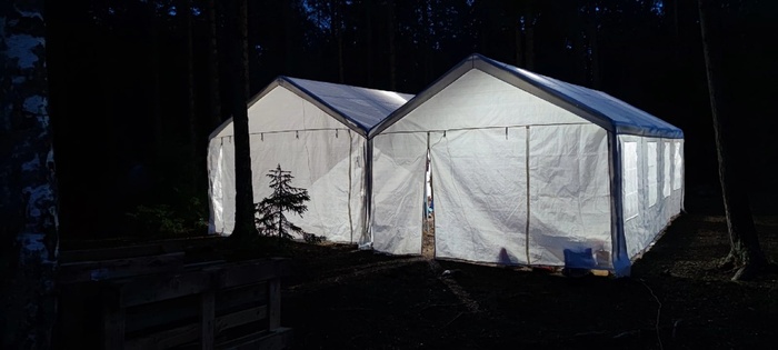 Сначала ставится рабочий шатёр. Если мероприятие в лесу, то нужно пространство 3х6 без откровенных ям и камней, с парой деревьев по краям. Если заброшка, то сначала (желательно, до основного заезда) пол для кухни подметается и промывается из мойки высокого давления.