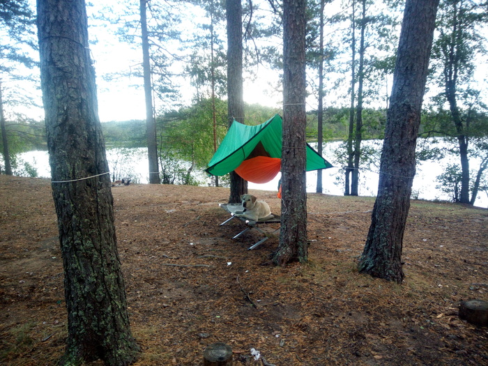 Пока закипает кастрюля, закрепите тент. В нашем случае тент должен плотно облегать шатёр, и вяжется паутинка: от каждого люверса идёт натянутая одноразовая верёвка к держащему площадку болту на ноге. Привяжите шатёр к деревьям нормальными верёвками. Идеальное крепление - все 4 угла. Допустимое - хотя-бы с двух сторон. Позовите собаку. Выйдите на обозримое место и ещё раз позовите.