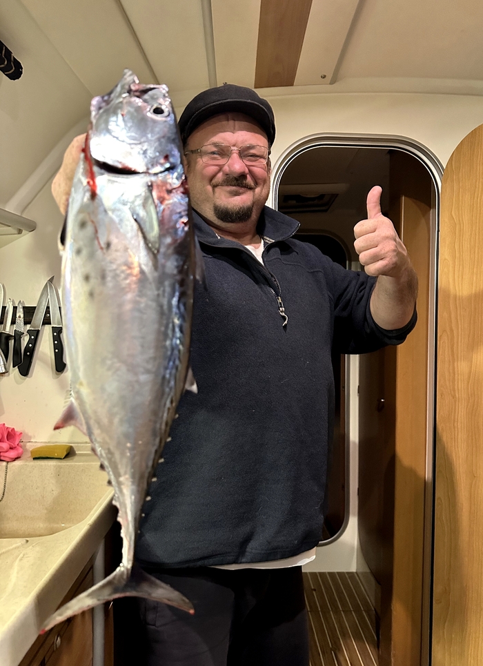 Конкретно этот небольшой тунчик был пойман у берегов Турции на траверзе острова Родос уже на закате. Вываживание его после треска катушки, сигнализирующего о поклёвке, взаимно обогатило лексикон всего экипажа разными специальными морскими словами . Но в целом прошло благополучно).