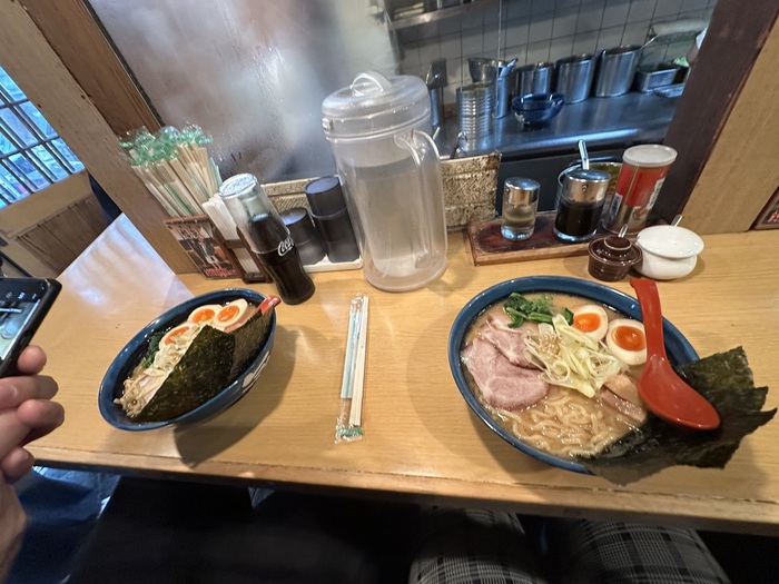 Рамен - ну это, наверное, самое известное блюдо. Очень густой суп из лапши с мясом/курицей/яйцом, там есть вариации, но что интересно, у него есть и вариации в названии, например, мы ели
