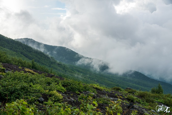 Хотелось сфотографировать вид сверху, но где-то в районе 8 станции застряло облако, и сверху ничего не было видно. Спуск оказался пологим и песчаным. Судя по всему, по этой дороге передвигаются на гусеничном транспорте, и возят на станции воду, доширак и остальное. Дорога спуска пересекается с подъёмом, и я вернулся по ней к домикам 8 станции. Там запасся водой (от обезвоживания уже начали болеть коленки), на удивление там можно было перекусить кари с рисом, и продолжил свой путь вниз.