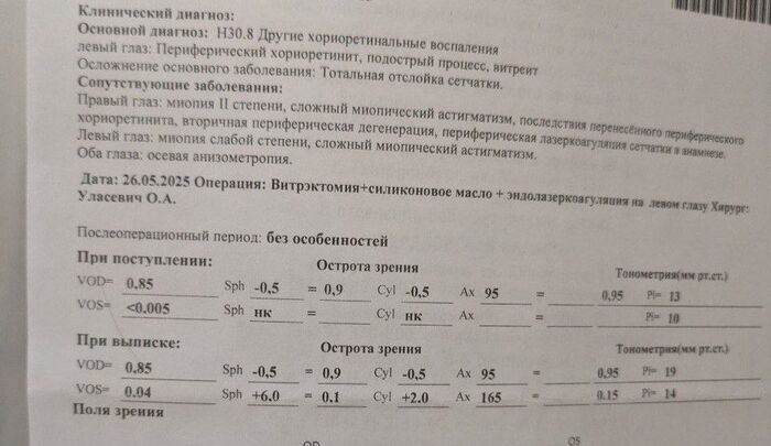 Сначала проверили зрение, хотя, честно говоря, на тот момент проверять было особо нечего, все было так плохо, что я различал только силуэты предметов, и они были искажены из-за поражений сетчатки. Ну понимал, с какой стороны мне светят фонариком)) Ни о какой остроте зрения речи уже ни шло. Далее, со мной уже беседовал заведующий отделением витреоретинальной хирургии, Уласевич Олег Анатольевич. В дальнейшем, он и спасал мой глаз на операционном столе.