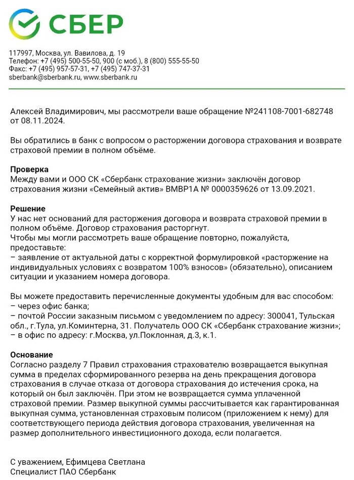 В сентябре 2021 года менеджер сбербанка Подобин Пётр Юрьевич, под видом накопительных инвестиций подписал меня на страхование "Семейный актив" с ежегодным взносом 172 467 рублей, номер договора ВМВР1А 0000359626. Договор я прочёл невнимательно и подписал - деньги ушли. Это предыстория. Я уже делал пару постов тут - основной момент это то, что банк берёт себе 17% от всех денег (с учётом прибыли от инвестиций) и более того он берёт с меня ещё 11% за рассрочку (договор на 10 лет и не вся сумма сразу):