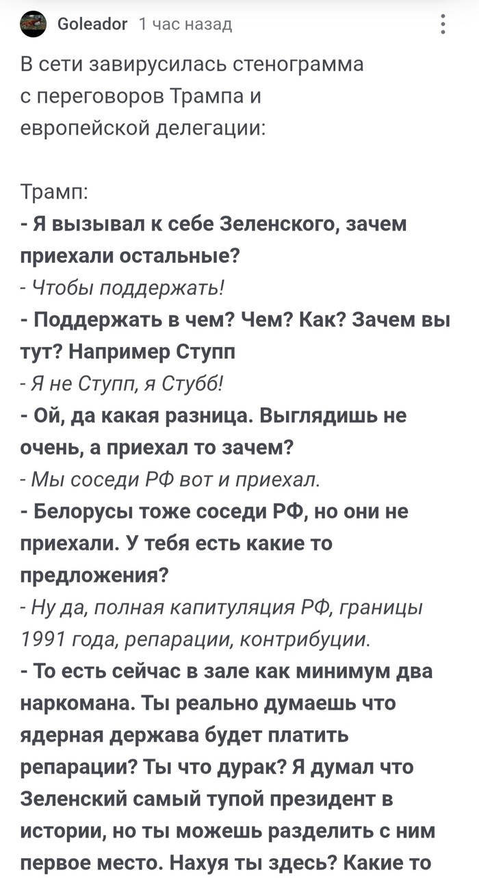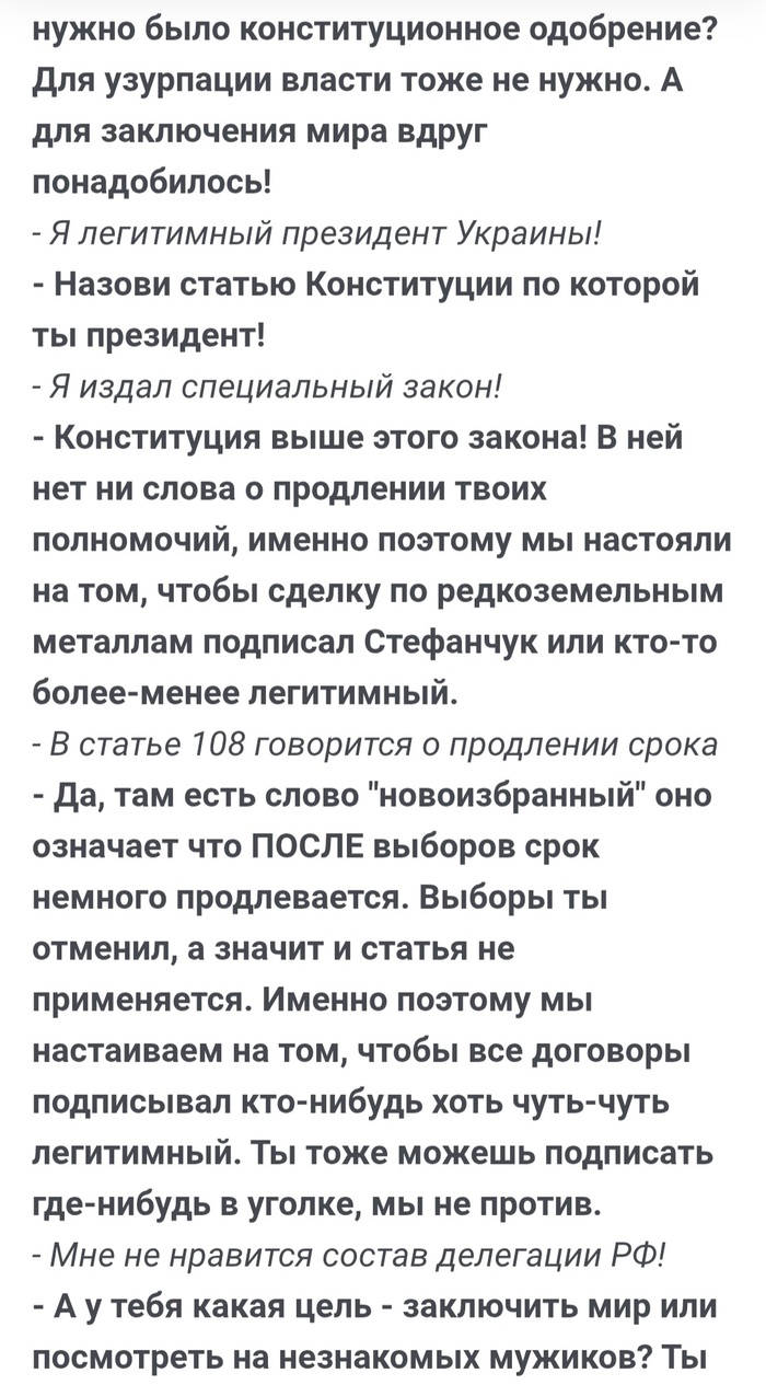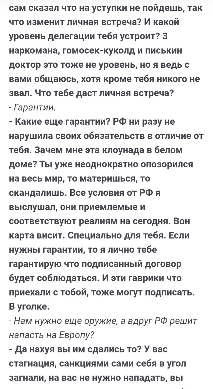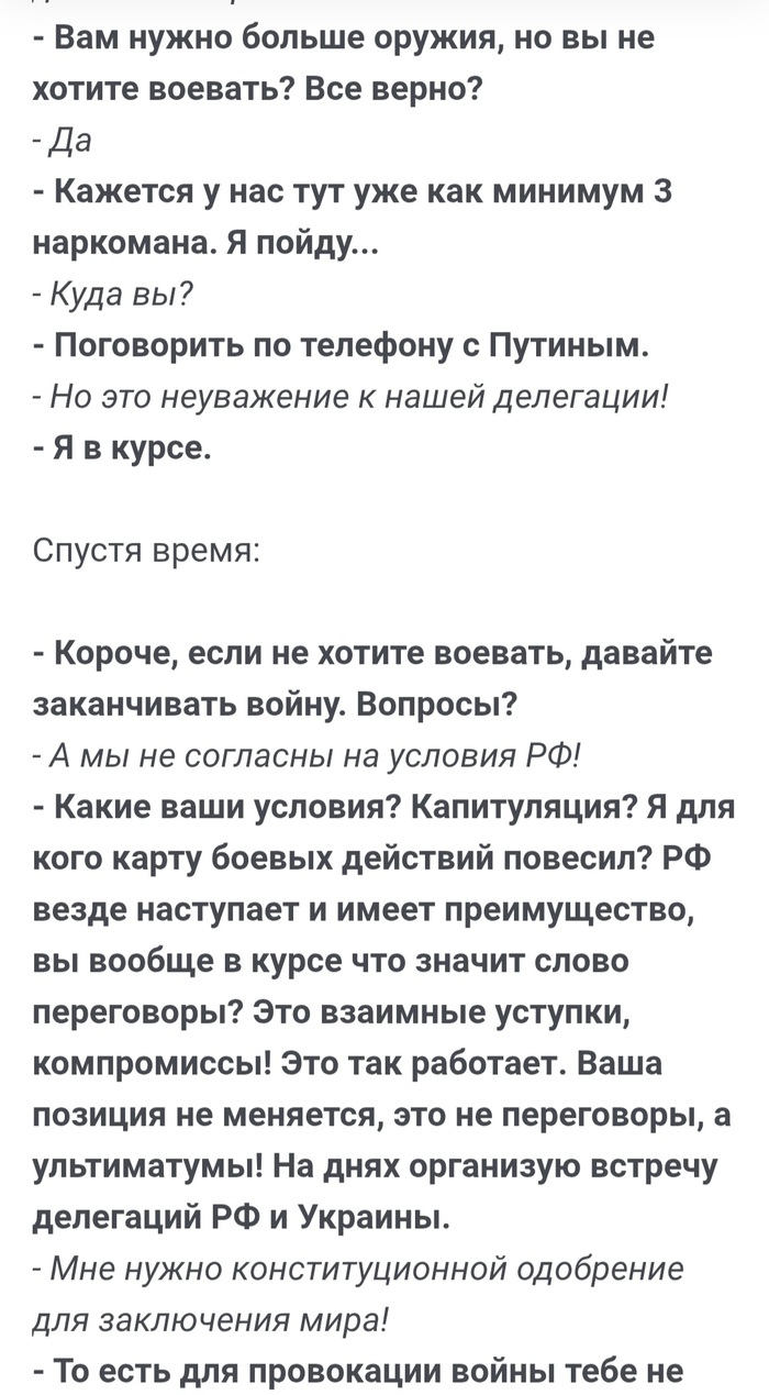 Россия: Мы идём на переговоры. Украина, будешь держаться за Молдавию – я и её туда дотащу.