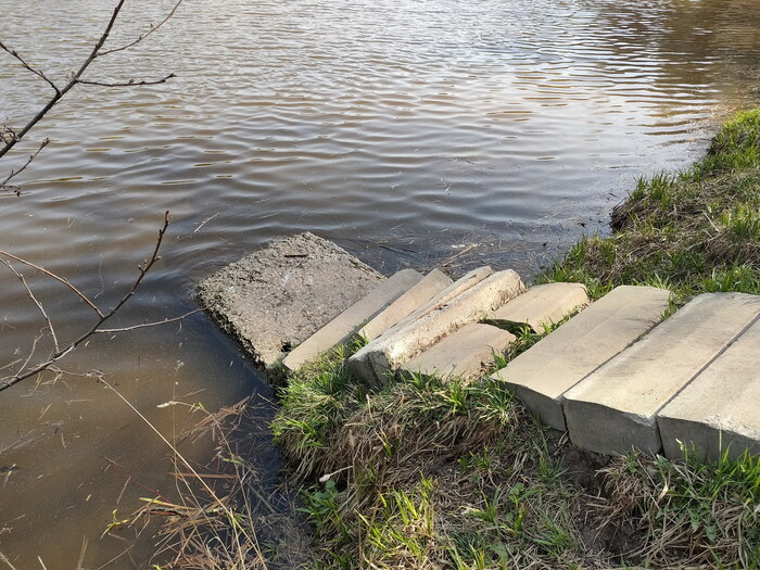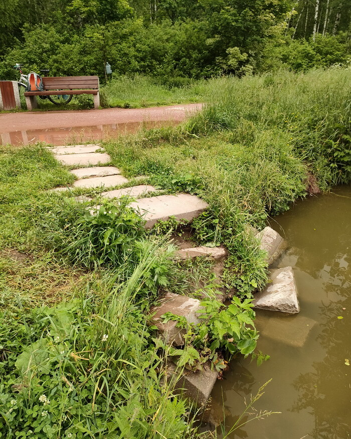 Теперь на месте помоста – груда травмоопасных камней (уложенных, вероятно, в качестве ступенек ещё в начале 70-х при создании пруда, и которые снесённый помост прикрывал):