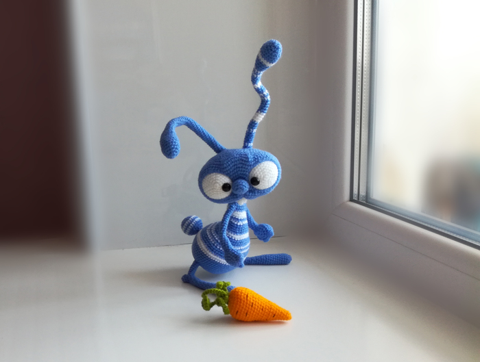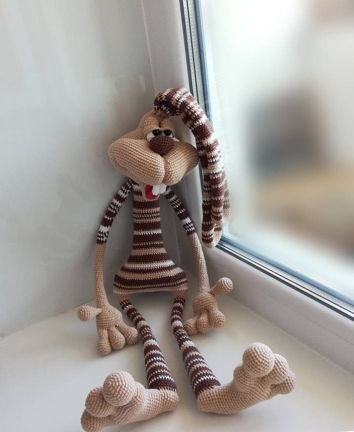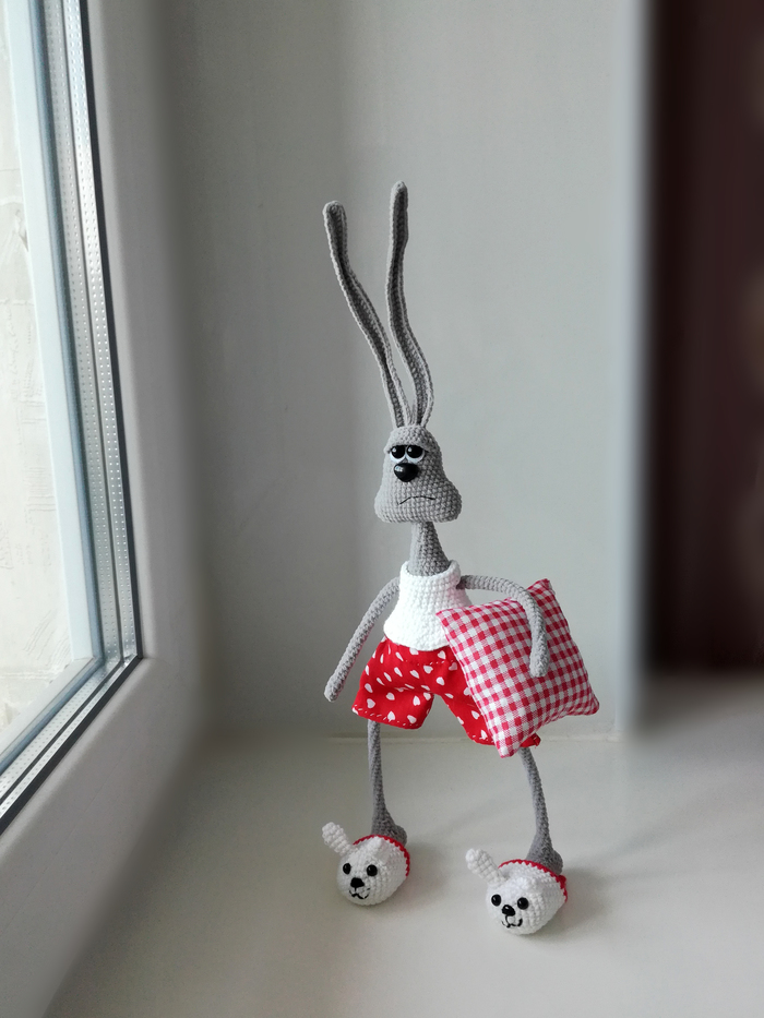 Ростом Кекс получился 60см, а с учетом ушей - 90см. Чтобы облегчить себе работу, решила делать игрушку без каркаса, о чем теперь жалею. Нужную форму не придашь, телепается, как сосиска. Вот, разместила его в кресле, посматриваю иногда на эту упоротую морду и улыбаюсь:)