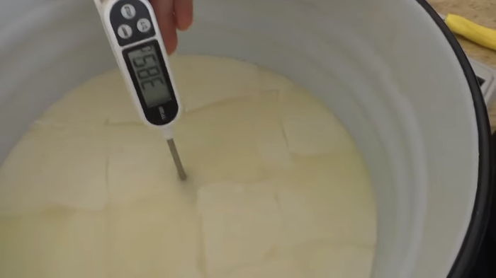Молоко схватывается и получатся сгусток, разрезаем его деревянной лопаткой на большие квадраты. ставим на медленный огонь и прогреваем до 40 градусов. После чего измельчаем квадраты венчиком (взбивать не надо). Еще минут на 15 оставляем под крышкой, в тепле.