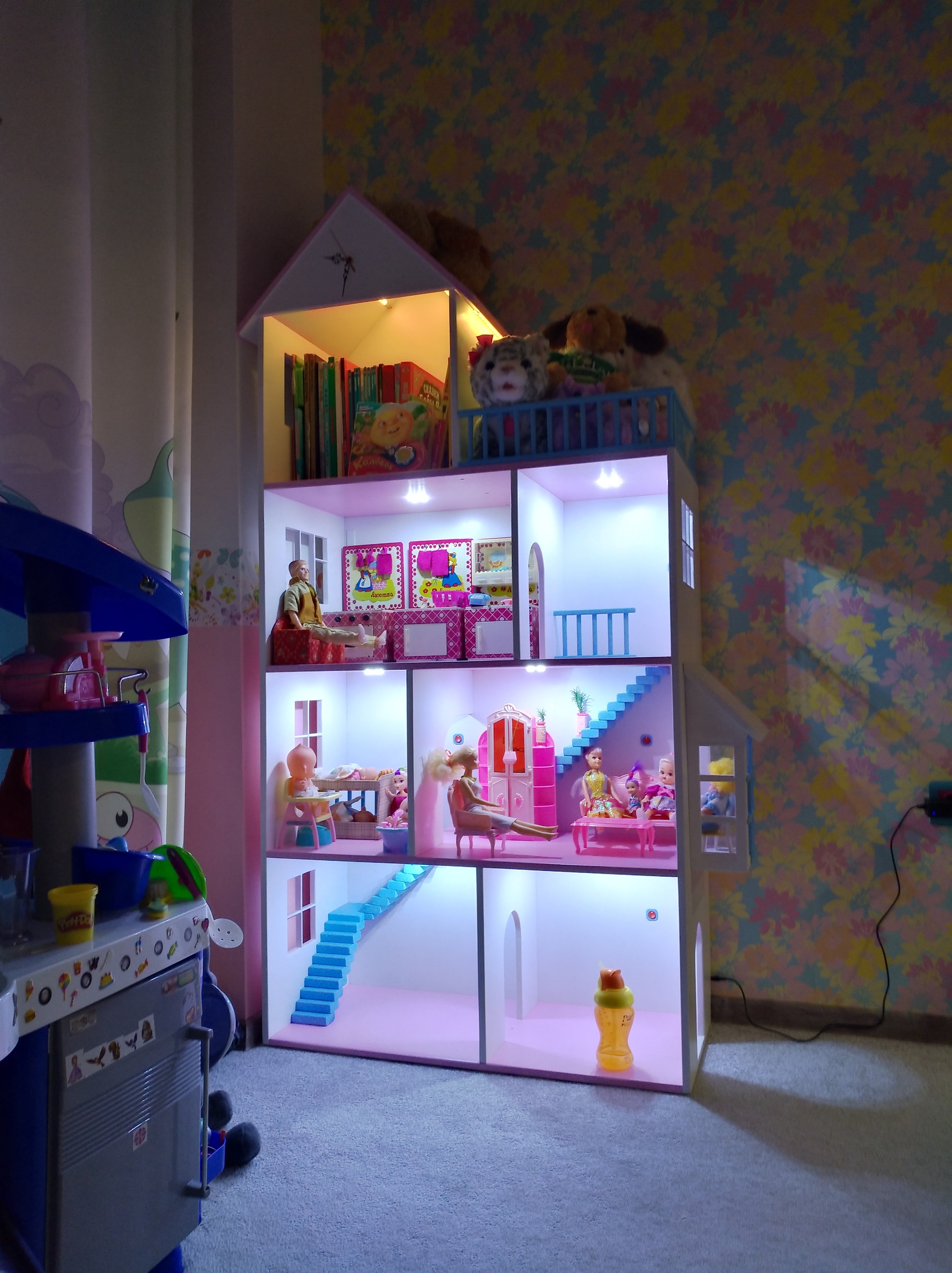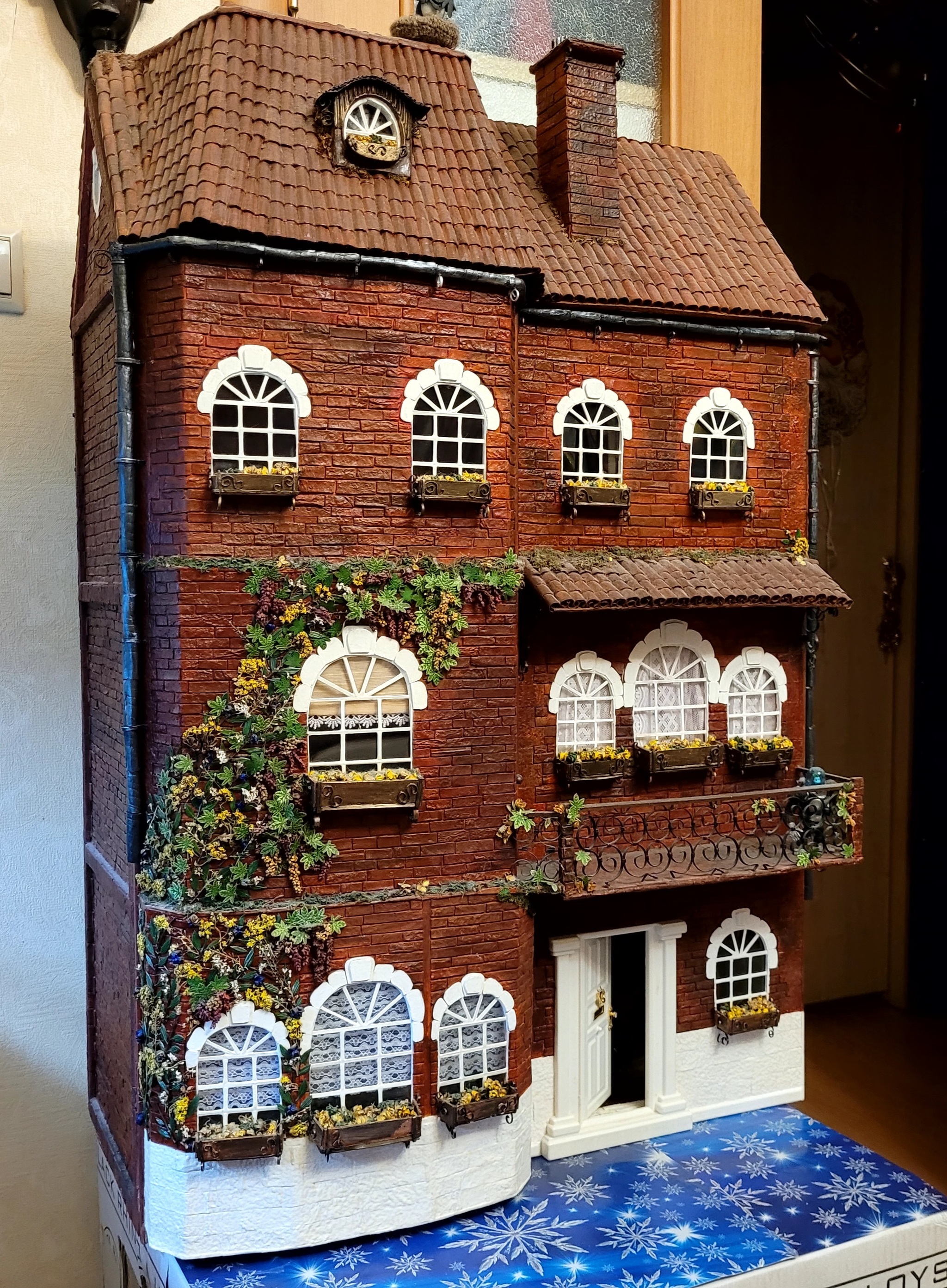 В каждой комнате был свет с отдельным выключателем. Уложено в скрытой проводке около 10 метров проводов. Всё хозяйство работает от шести батареек АА, для которых сделана отдельная электрощитовая сбоку домика ))) Был даже работающий камин! (Он вообще отдельного поста заслуживает). На окнах полноценные подоконники, карнизы для штор (подразумевалось, что дочка с мамой впоследствии сошьют шторы туда), лестницы, почтовый ящик.