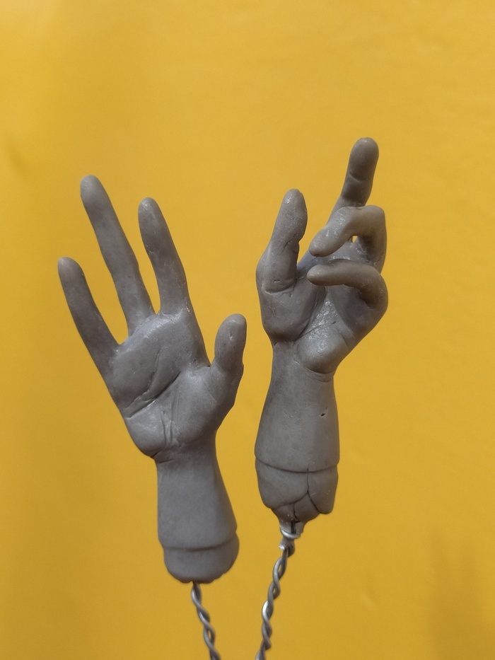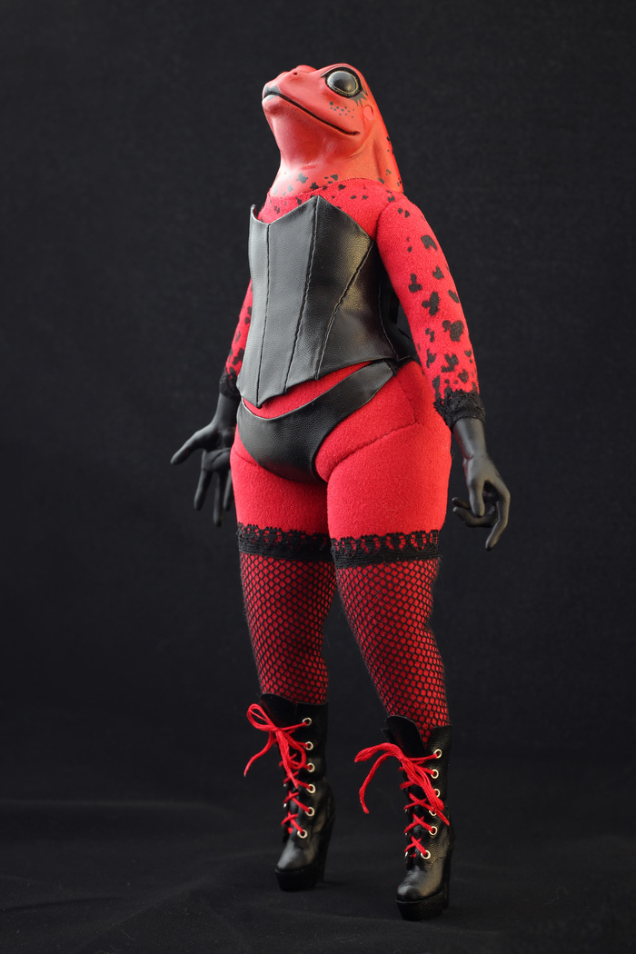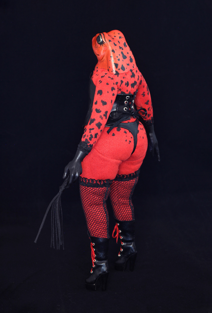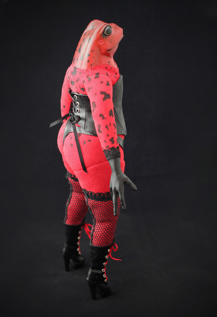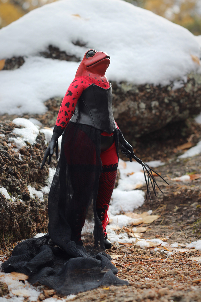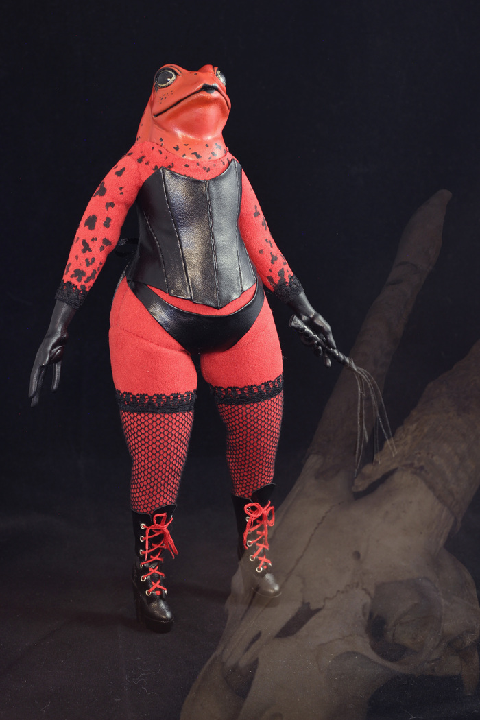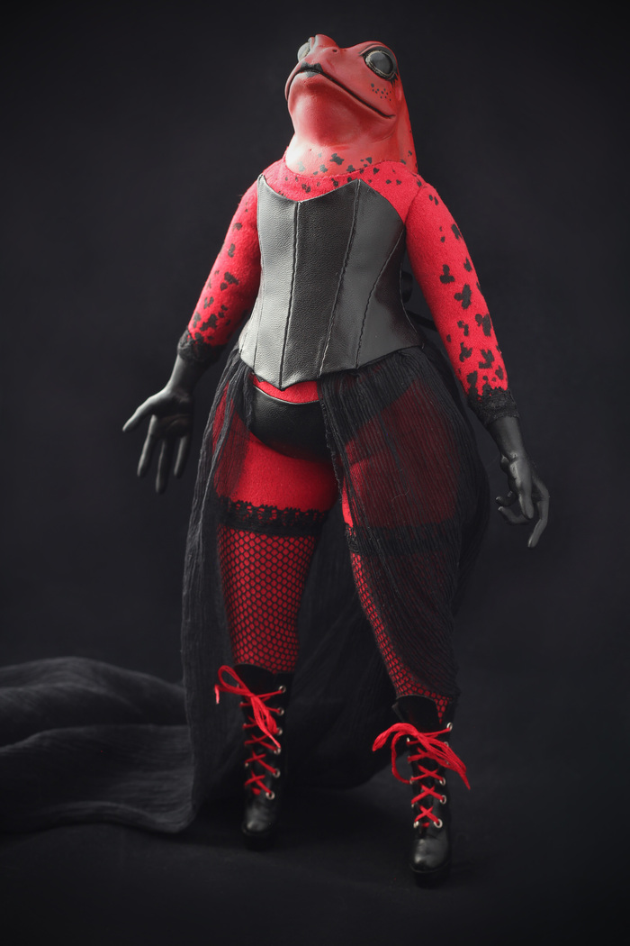 Голова и руки из полимерной глины, тело сшито из искусственной замши, внутри подвижный проволочный каркас. Вся одежда, кроме чулок и сапог, съёмная; плётка вынимается из руки. Высота около 28 см, может стоять без опоры (только не на опавших листьях).