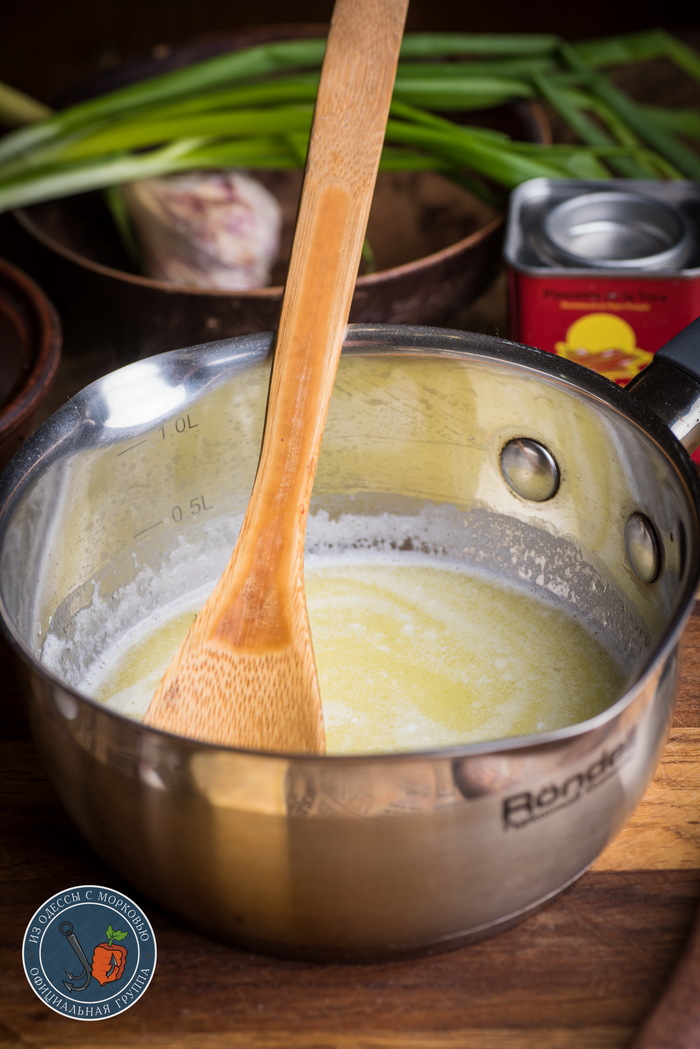 - В сотейнике или небольшой кастрюле смешать воду, сливочное масло, соль и на среднем огне довести до кипения. Добавить муку и сняв с огня тщательно размешать деревянной ложкой до тех пор, пока все хорошо не смешается, а сама масса не начнет легко отходить от стенок сотейника. Обычно на это уходит полминуты- минута, если тупить. По сути мы получили заварное тесто.