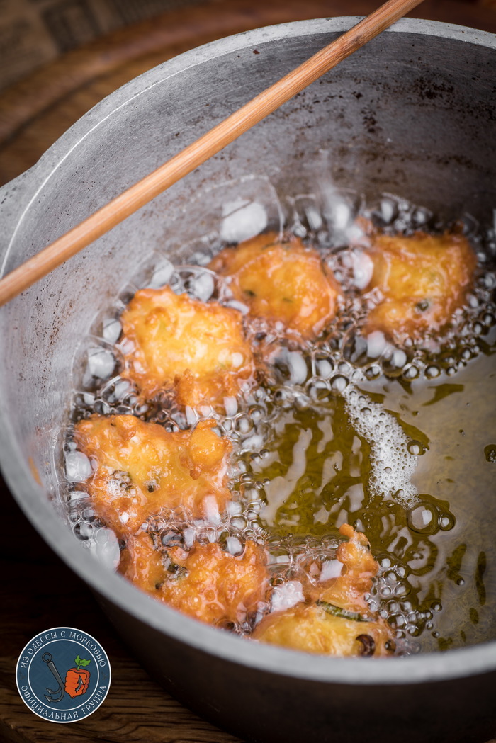 - С помощью двух ложек сформировать шарики. На деле это звучит не так элегантно, как в тексте, но делается достаточно просто. Я использовал десертные ложки: одной набирал, второй сдвигал шарик в масло. Тесто в масле тут же начинает немного раздуваться. Все, теперь можно не трогать и не переворачивать. В зависимости от температуры, количества шариков и размера посуды, будет плясать и время готовки. Но обычно пары минут хватает. Смотрите по цвету- он должен быть уверенно золотисто-коричневым. И не перегружайте посуду. В мой маленький казан свободно помещалось 6-7 штук за раз. В сковороду поместится больше.