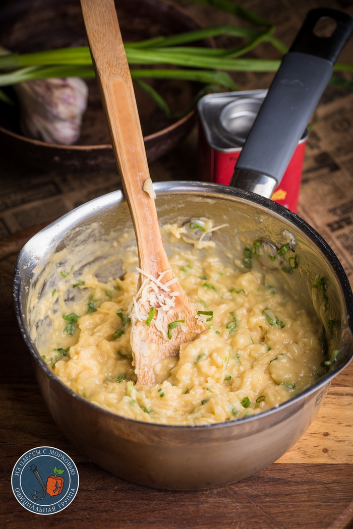 - Добавить натертый на мелкой терке сыр, чеснок натертый на терке или прожатый через чеснокодавку и мелко нарезанный зеленый лук.