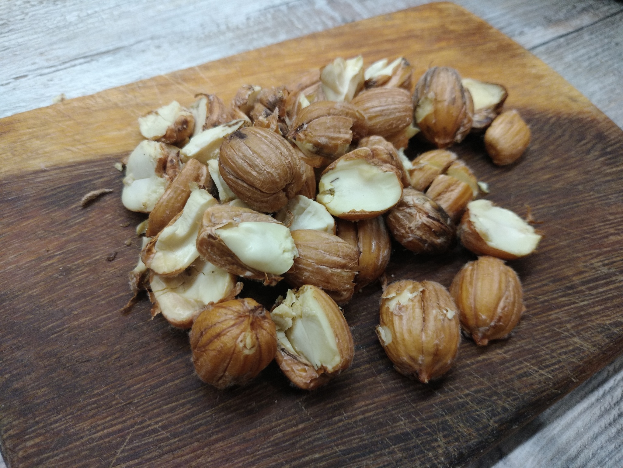 Две горсти громаднющих желудей от американского дуба превратились в 100 грамм чищеных орехов с пушистыми попками - очень похожих на майских жуков.
