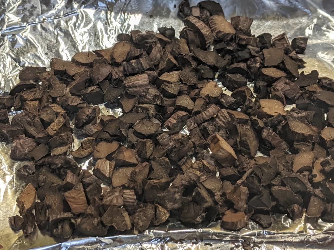 Чем равномернее кусочки, тем проще обжаривать. После первого захода я поняла, что лучше на сковородке - по времени баш на баш, но удобнее помешивать и нет риска все спалить.