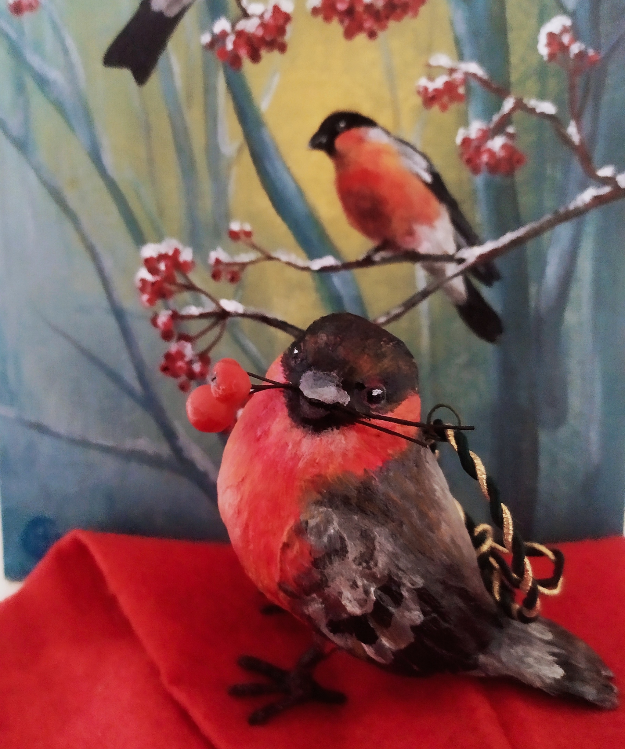 Покрасила акрилом. Прилелала петельку, чтобы вешать на ёлку. Муж сказал, что выражение физиомордии у птицы вышло суровым, типа "Я пришел сюда покушать ягодки и нагадить тебе на голову, и как видишь, ягодки я уже покушал!". Ну ничего, главное, что в моем рукоблудии узнали снегиря)) Нарисовала открыточку на маленьком холсте. Потому что, а почему бы и нет)