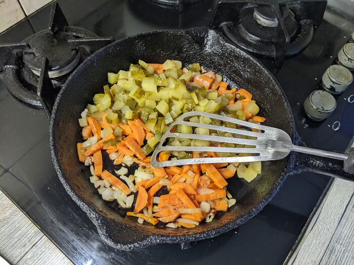 Пара соленых огурцов (у меня своего посола, но можно и маринованные из магазина).