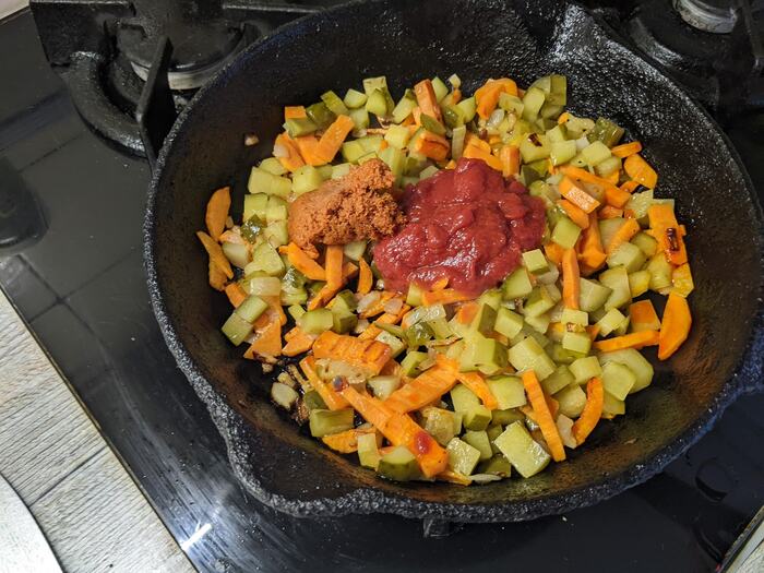Добавляем либо 2 ложки томата, либо 1 ложку томата и 1 ложку ароматной острой пасты. Быстро перемешиваем.