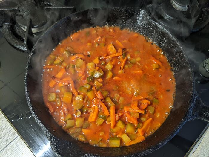 Проверяем, как там картошка. Если уже мягкая - отправляем к ней в бульон томатную заправку. Если собираетесь свежую рыбу класть - тоже сейчас самое время.