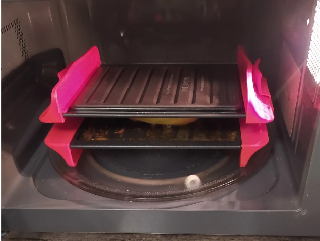 Эту микроволновую приблуду купила жена, увидев в рекламе у какой-то мадамы из инсты (запрещенная в РФ что-то там). Она из металла, который можно совать в свч.