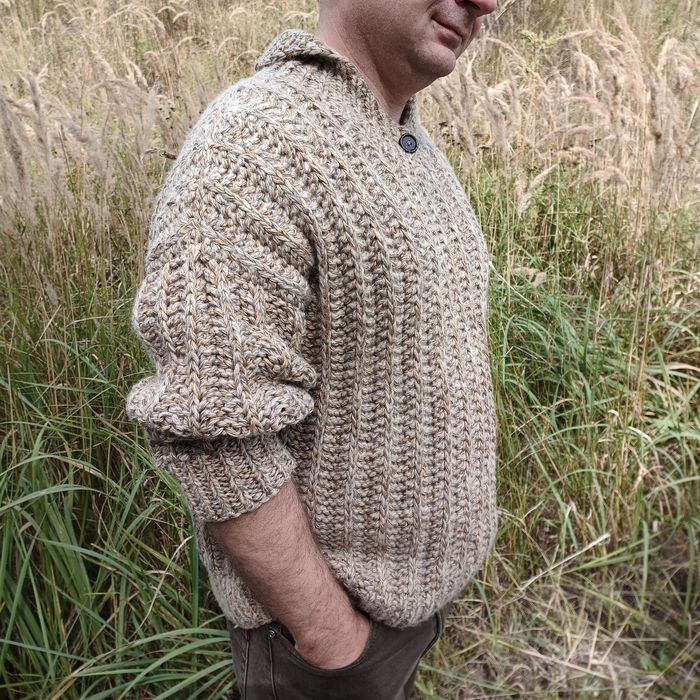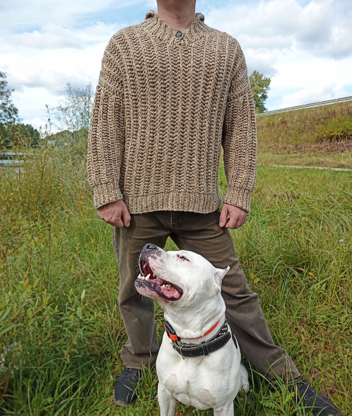Единственное, что сама забыла при стирке положить в мешочек, и свитер подвалялся немного больше, чем я планировала. Но благо лен и хлопок спасли ситуацию и я не вытащила из машины свитер на кота. Но на 2-3 см получился меньше, чем хотели. А с другой стороны свитер вышел пуленепробиваемым. Хоть на вид и вес он прям мужицкий (извините за сексизм), но на ощупь - нежнятина. В будущем, брала бы гребенную шерсть всё-таки и спицы на размер меньше, чтобы упростить процесс стирки. Хотя пушистая кардная шерсть легче и теплее.