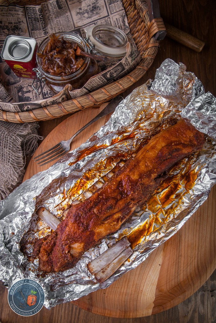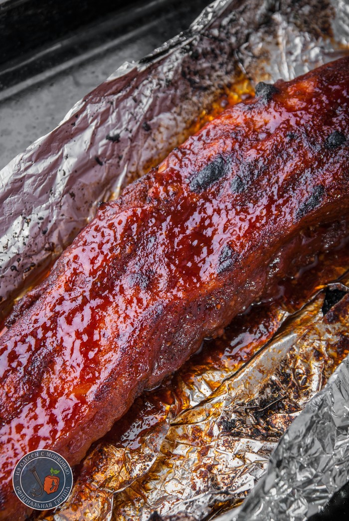 - Считаем, что 3 часа минули. Откройте ребра, дайте мясу остыть 5 минут и выньте сами ребра из мяса - они вынимаются легко. (если не хотите ждать, просто возьмите бумажные полотенца или щипцы и вынимайте ими). Обильно смажьте верхнюю сторону соусом с медом. Включите верхний гриль и не отходя к компу готовьте пока не подрумянится (а если его нет, то просто допеките в духовке до подсыхания верха и красивого цвета)