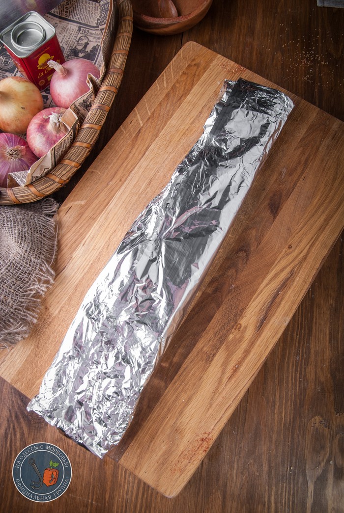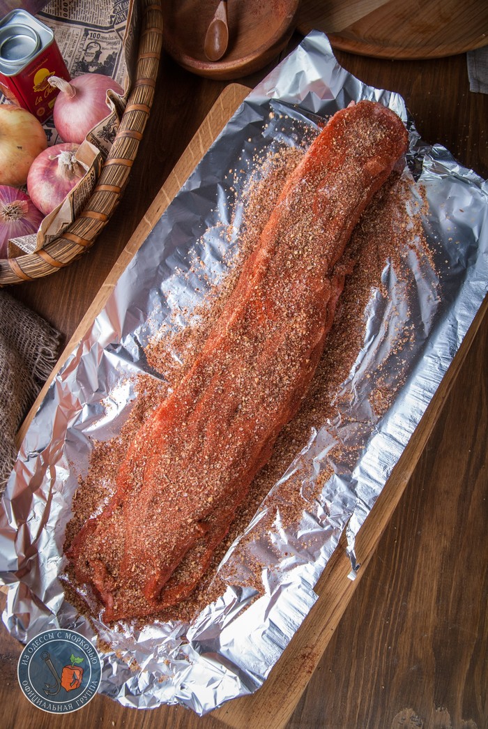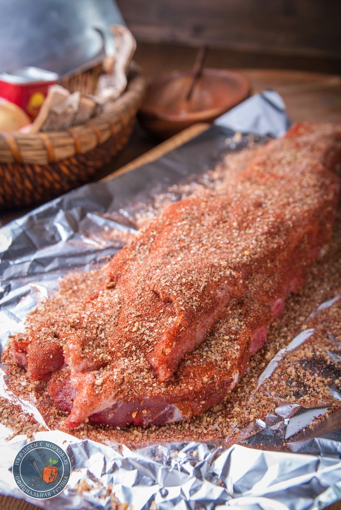 - Смешать все специи. Выложить ребра на фольгу и тщательно натереть\обсыпать специями, с двух сторон, втирая в торцы.