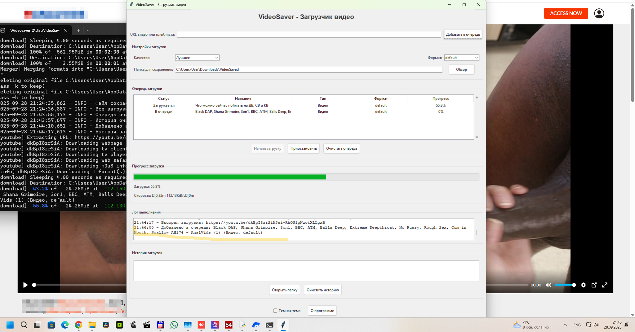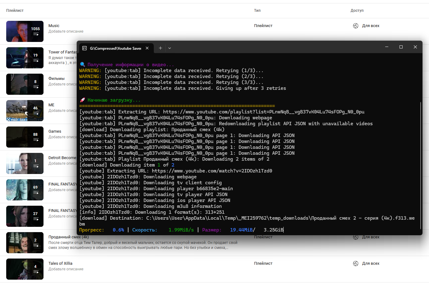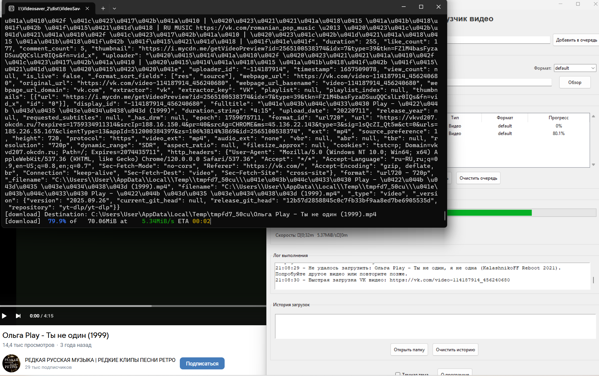 Делался для тыртуба и вк, но работает почти везде где есть кнопка - поделиться. собирал на питоне, исходник в комплекте, проверяет при запуске новые версии ffmpeg yt-dl, подгружает их в папку где располагается тело программы. После загрузки создаётся C:\Users\User\Downloads\VideoSaved и открывается сам каталог. Принцип работы, запускаем прогу, она, если в каталоге нет нужных компонентов сама подгружает их с гитхаба и распаковывает рядом с телом, в консоли предлагается выбор что сделать. На тыртубе, одноглазиках, вк есть кнопки поделиться, нам нужен код, копируем в проге правой кнопкой нажимаем, он вставился, жмём Enter, прога перебирает все доступные варианты и скачивает максимальное качество видео+аудио, микшует всё это в mkv с оригинальным названием.