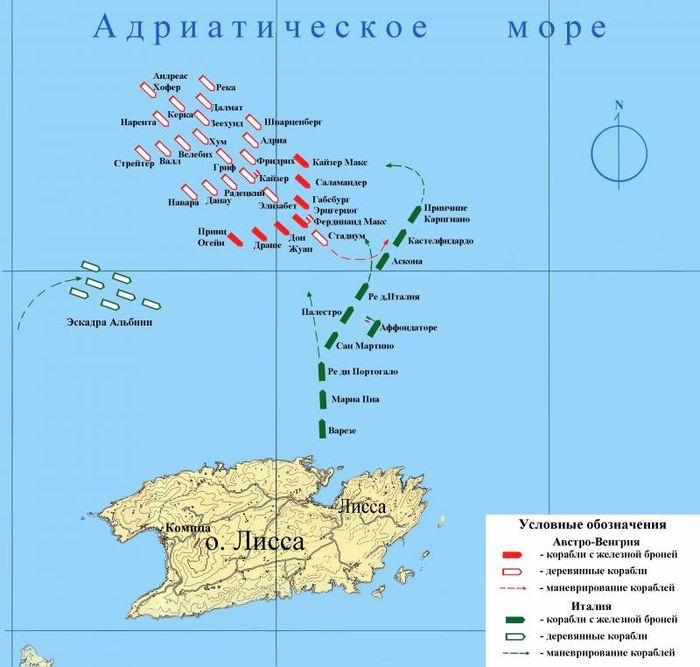 У Италии было больше кораблей, но боевой дух был существенно ниже. Адмирал Карло Пеллион де Персано не желал выводить флот в море, оправдывая это неготовностью к бою. В это время его противник контр-адмирал Вильгельм фон Тегетхофф активно приводил морские силы в боевую готовность. Он получил эту должность накануне войны, но уже успел сделать многое. Флот получил пару новых броненосцев, а устаревшие деревянные линкоры обшивались обрезками рельс и цепями.