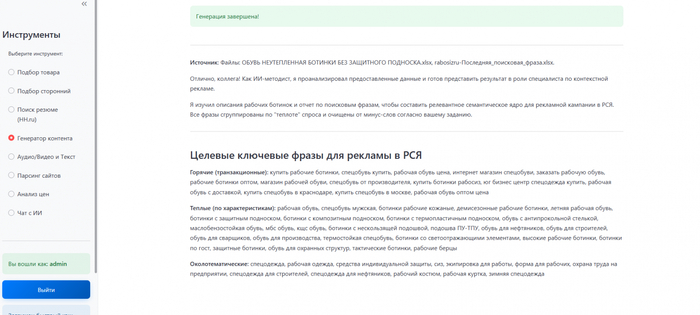 «Ты — специалист по контекстной рекламе. На основе загруженных данных составь список целевых ключевых фраз для рекламы в РСЯ. Разбей их на группы: горячие (транзакционные), теплые (по характеристикам) и околотематические. Исключи слова "бесплатно", "скачать", "фото" и прочие. Формат вывода: список через запятую».