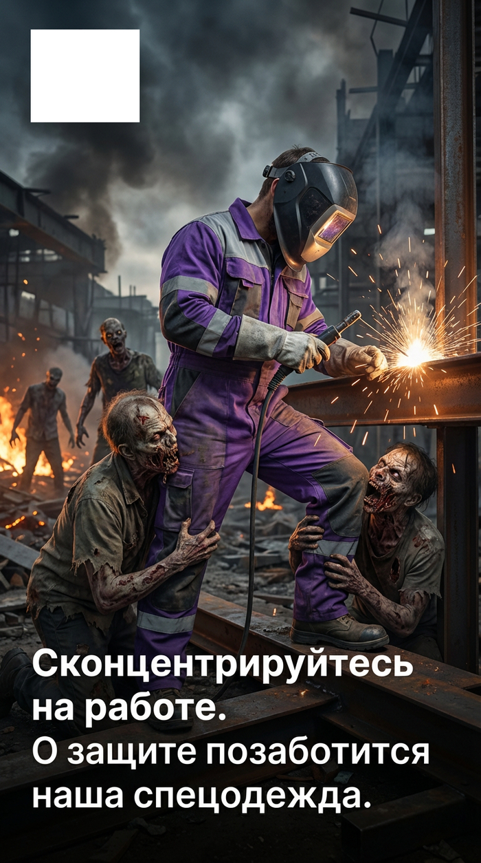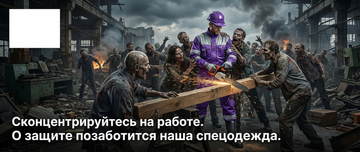 Визуал: Типичный рабочий цех или стройка, но вокруг — зомби-апокалипсис. Один рабочий спокойно выполняет свою задачу (например, пилит доску), в то время как зомби безуспешно пытаются прокусить его плотный комбинезон и защитные ботинки.