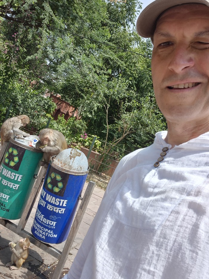 На деле же посреди шумных, грязных, тесных улиц в дымке смога возвышаются величественные стены Агра-форта и белый мраморный Тадж Махал. Снующие туда-сюда, вечно гудящие туктуки, люди, обезьяны, собаки, коровы кажутся мурашами, и такими неважными по сравнению с величием, оставленным предками. Обезьяна внаглую отбирает у меня мороженое, не боясь никого. По пешеходной аллее ползет змея.